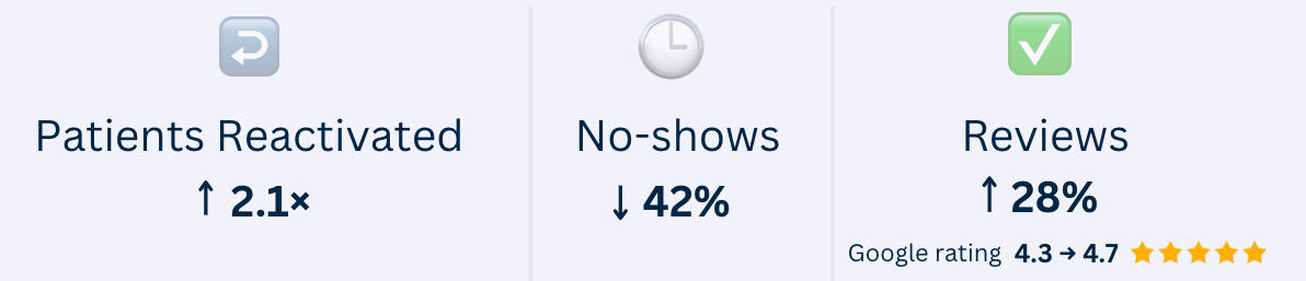 Add automated reactivation, no-show recovery, and review-boosting — without changing clinic workflows.