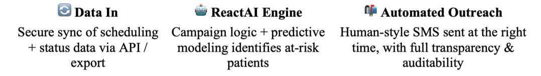 Today, most EMRs handle scheduling, documentation, and billing — but patient follow-through still relies on manual staff effort.ReactAI: